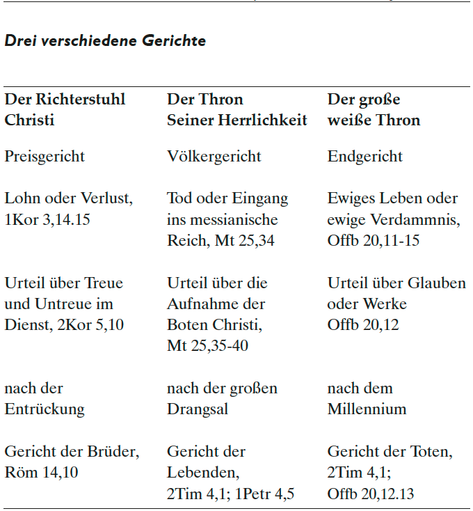 Zu den biblischen Gründen, das »Schafe-Böcke-Gericht« und das »Gericht am Großen Weißen Thron« zu unterscheiden und nicht zu einem »Jüngsten Gericht« zusammenzuwerfen, gehören zusammenfassend folgende neun:
